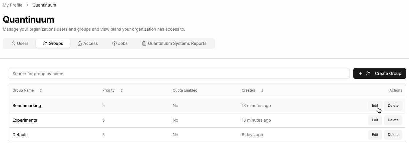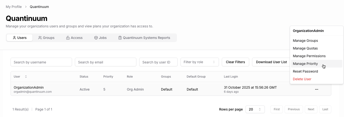 Organization administrators can see and manage the priority of users and groups from the management page. User or Group priorities are currently only taken into account for jobs submitted to Quantinuum hardware.