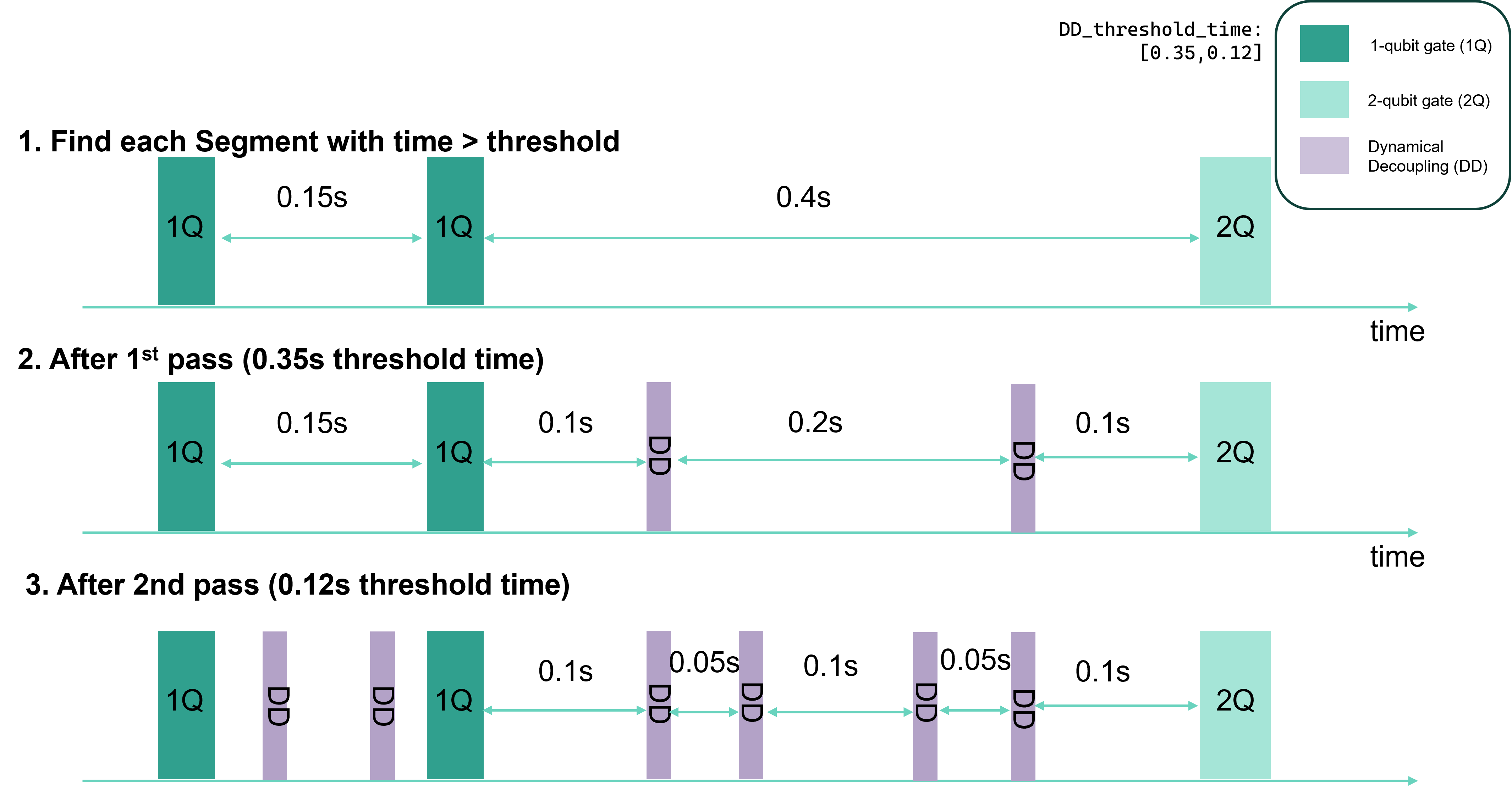 For a specified DD_threshold_times, the hardware compiler will search for idle times (times where a qubit receives no operation) that are \(\geq\) DD_threshold_times and find DD pulse locations to decouple the coherent memory error.