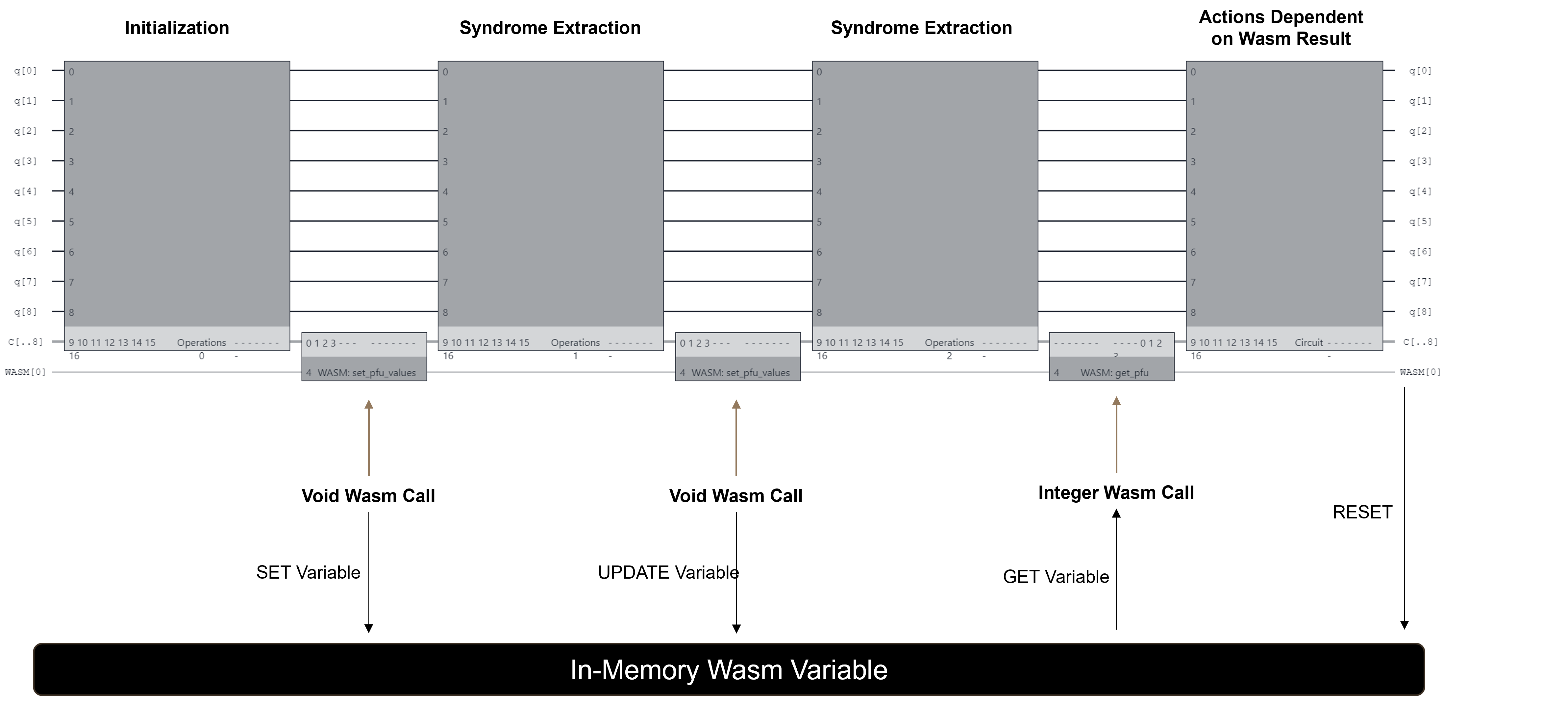 Wasm is an industry standard for sandboxed computing. To compile Wasm binaries, a low-level programming language, such as Rust or C, are used to compose desired classical functions before compilation. The quantum computing workflow will then contain a call to Wasm. Wasm is used because it is fast, safe, expressive, and easy to compile with familiar programming languages. Measurement results are processed on WAVM, where a decoding algorithm is used to determine recovery operations and update quantum circuits in real-time. Once generated, the Wasm binary can be injected into a TKET workflow. “Async” Wasm calls involve execution of a void (no output) Wasm function during the TKET circuit execution. The Wasm result is polled until a non-void (one integer output) Wasm function is used to access the Wasm result. This is an important feature that helps reduce qubit idling time and ultimately minimizes the impact of memory error in TKET + Wasm programs.