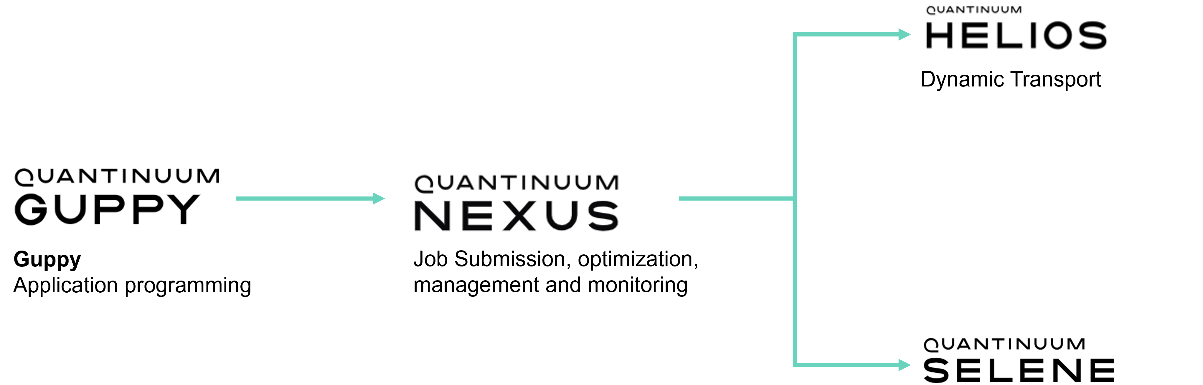 Guppy is a quantum-first programming language that leverages the next-generation runtime on Helios to execute programs with arbitrary control flow and classical compute. More information is available at Guppy documentation. Nexus is a cloud-native Platform-as-a-Service (PaaS) that provides access to Quantinuum Helios, in addition to cloud Selene instances. A workflow schematic is provided below.